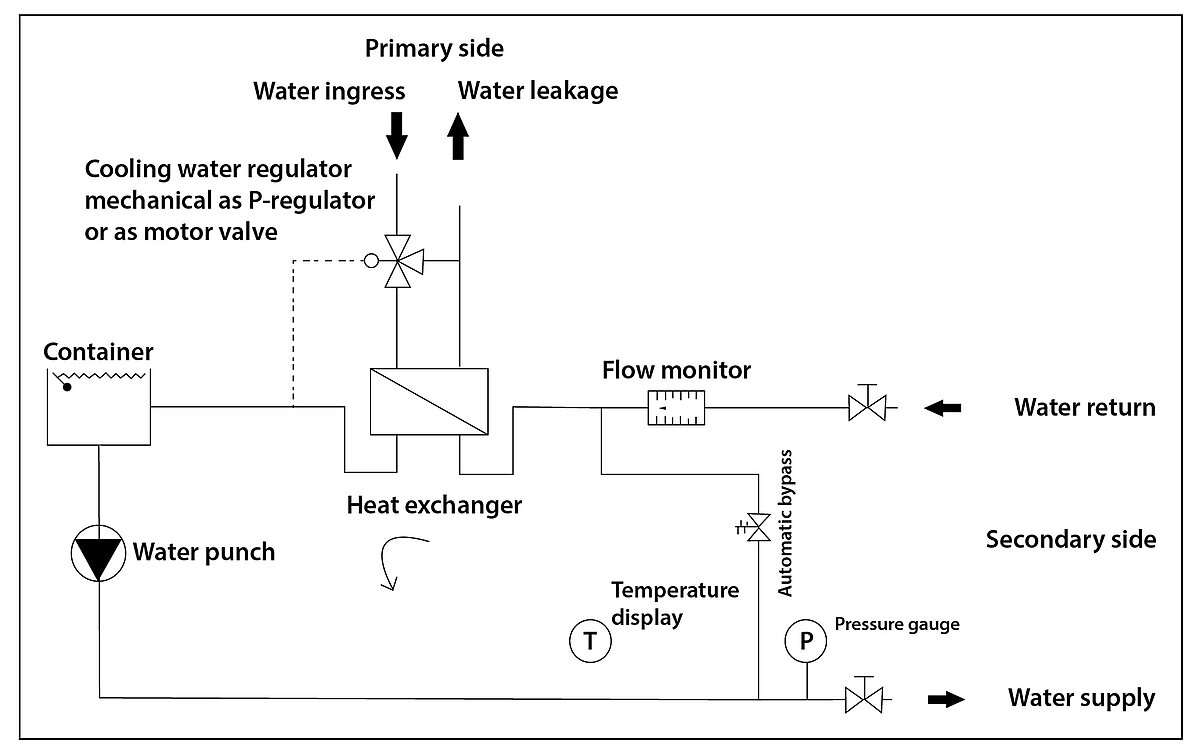 All models are specially designed according to your existing cooling water network and can be supplied with an output of up to 150 kW.The standard models are all equipped with a bypass, pressure gauge and flow monitor for flow monitoring.